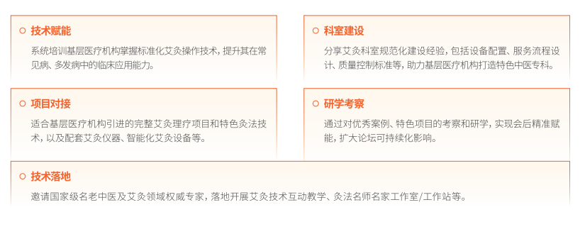 为进一步提升基层中医艾灸适宜技术服务能力,充分发挥艾灸疗法在治未病、疾病治疗和康复中的重要作用,论坛重点围绕五个方面常态化开展工作: